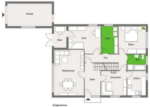 Das Erdgeschoss überzeugt neben einem Wohn- und Esszimmer, einer separaten Küche sowie einem gesonderten Schlaftrakt mit zwei Schlafzimmern, Arbeitszimmer, einem Badezimmer und einem Hauswirtschaftsraum.