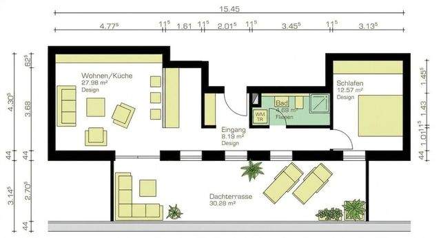 Die 61 m² Wohnfläche teilen sich wie folgt auf: